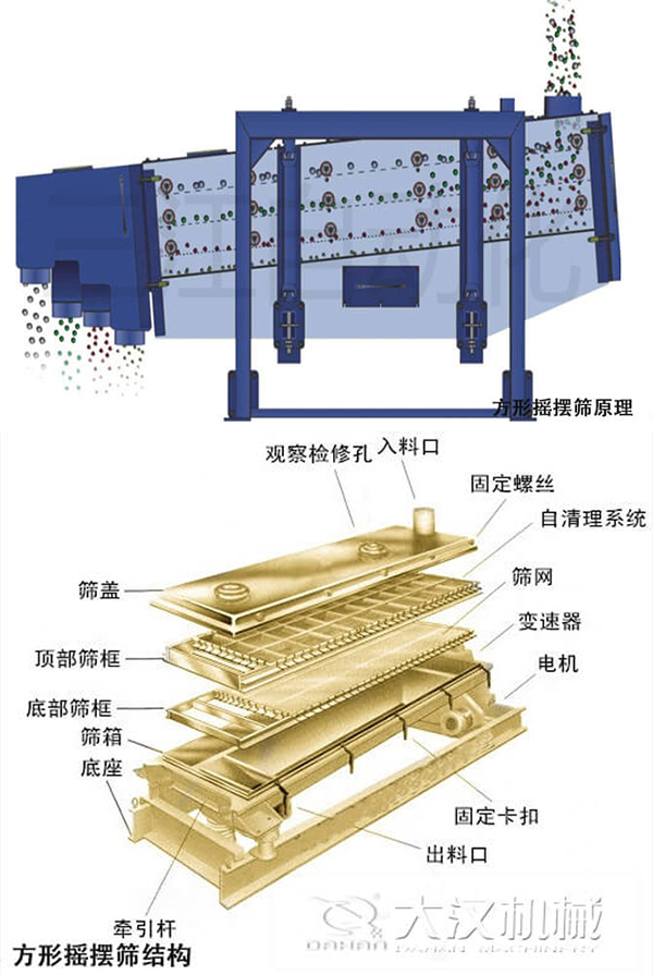 方形搖擺篩的主要結構有:傳動裝置,布料器,篩箱,支撐架,驅動裝置等。
