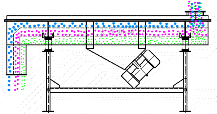 直線振動篩利用振動電機激振作為振動動力來源,使物料在篩網上被拋起,同時向前作直線運動,物料從給料機均勻地進入篩分機的進料口,通過多層篩網產生數種規格的篩上物、篩下物、分別從各自的出口排出。