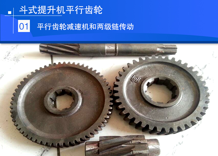 該方式采用老式平行齒輪減速機,在驅動電機與減速機輸入軸之間、減速機輸出軸與提升機頭部驅動軸之間采用鏈式傳動。優點是成本低,缺點是傳動環節多,結構復雜,效率低,維護工作量大,運行成本較高。