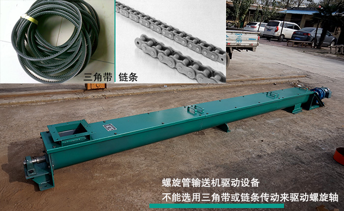 (1)螺旋管輸送機(jī)驅(qū)動(dòng)設(shè)備不能選用三角帶或鏈條傳動(dòng)來驅(qū)動(dòng)螺旋軸,以防止軸端在徑向力效果下,發(fā)生懸臂載荷,使整個(gè)機(jī)體脫離托輪。